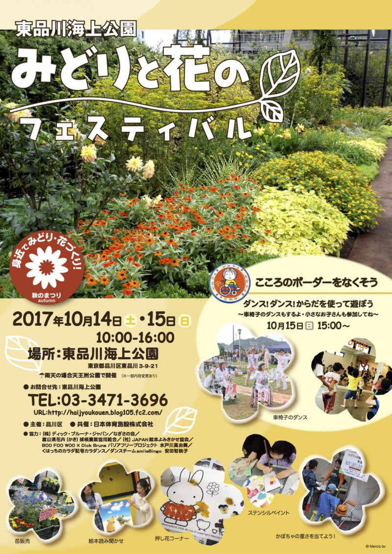 10月14,15日の2日間、東品川海上公園で、当団体理事の水戸川真由美がプロジェクトリーダーを務める「BOO FOO WOO × Dick Bruna バリアフリープロジェクト」が協力している「みどりと花のフェスティバル」が開催されます。お時間がある方はぜひのぞいてみてください。